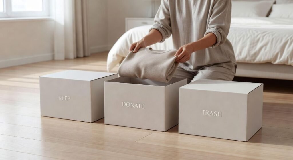 Keep three large boxes nearby labeled keep, donate, and trash. Force yourself to place every item into one specific box immediately. Do not create a hesitant maybe pile, because that just delays the final decision. Quick choices help you build a peaceful retreat much faster and easier.